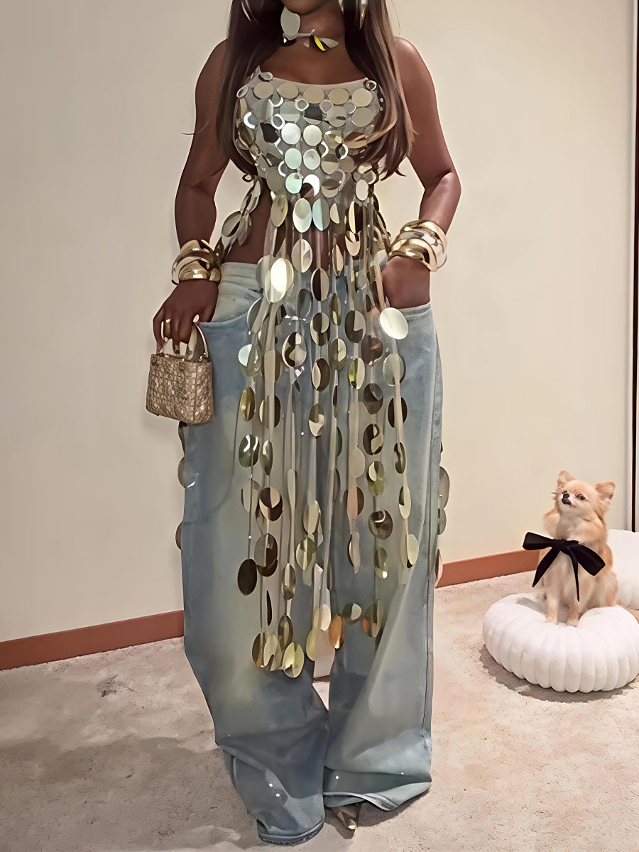 - Sparkly sleeveless top covered in shiny sequins for a glamorous look.